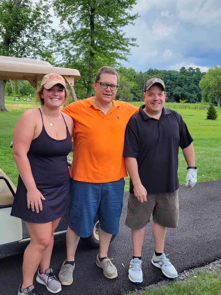 Mike, Rick, and Marley – more smiles before that cloud above them poured down with one hole to go.