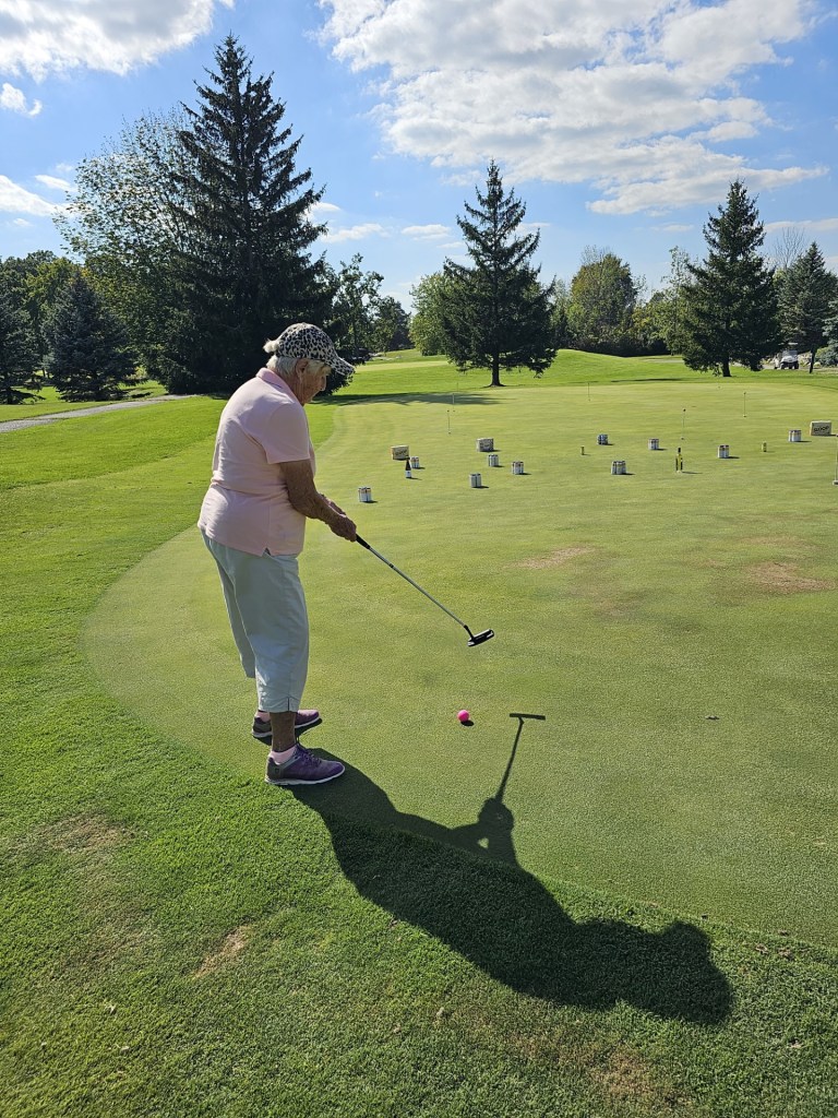 Cheryl from Talk to Me Birdie lines up her shot.